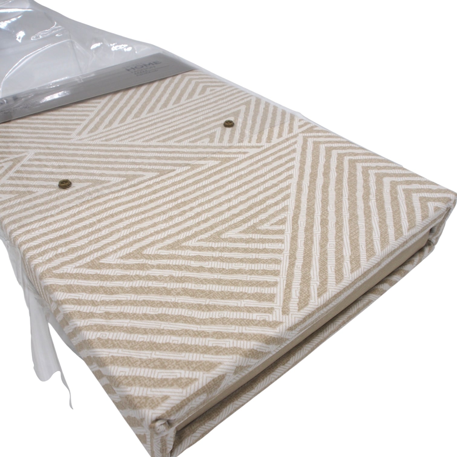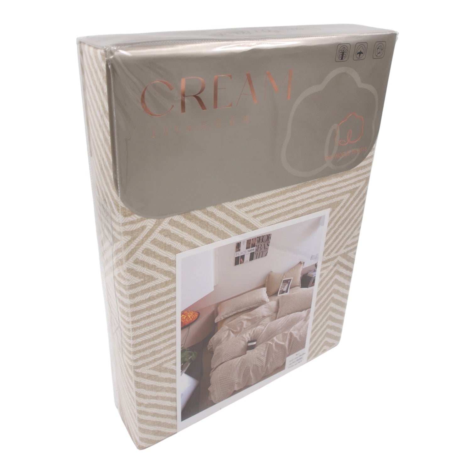 Šio komplekto dizainas išsiskiria geometriniu, šiuolaikišku raštu: švelnus smėlio atspalvis derinamas su baltomis linijomis, kuriančiomis subtiliai išdėliotus kampus ir formas. Toks raštas miegamajam suteikia prabangos, jaukumo ir modernumo, o neutrali spalvų gama lengvai dera prie bet kokio interjero – nuo minimalistinio iki klasikinio.