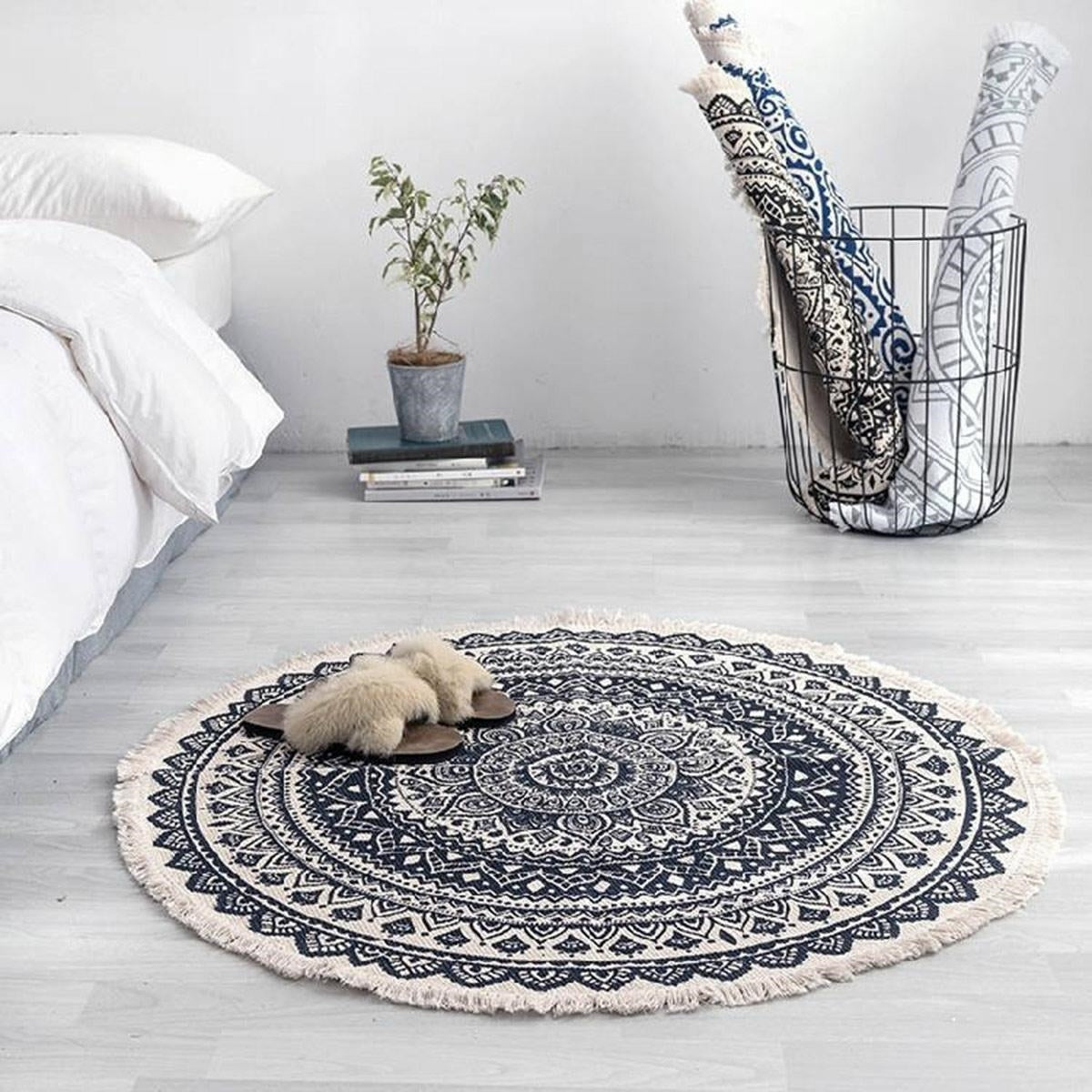 Apvalus boho stiliaus dekoratyvinis kilimas. Pagaminta iš malonios liesti medžiagos. Puikiai tinka kaip svetainės kilimėlis arba prieškambaryje.