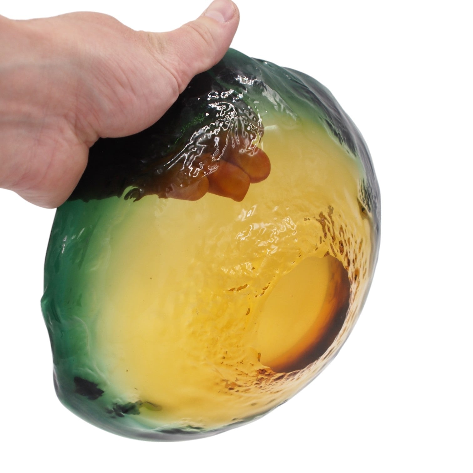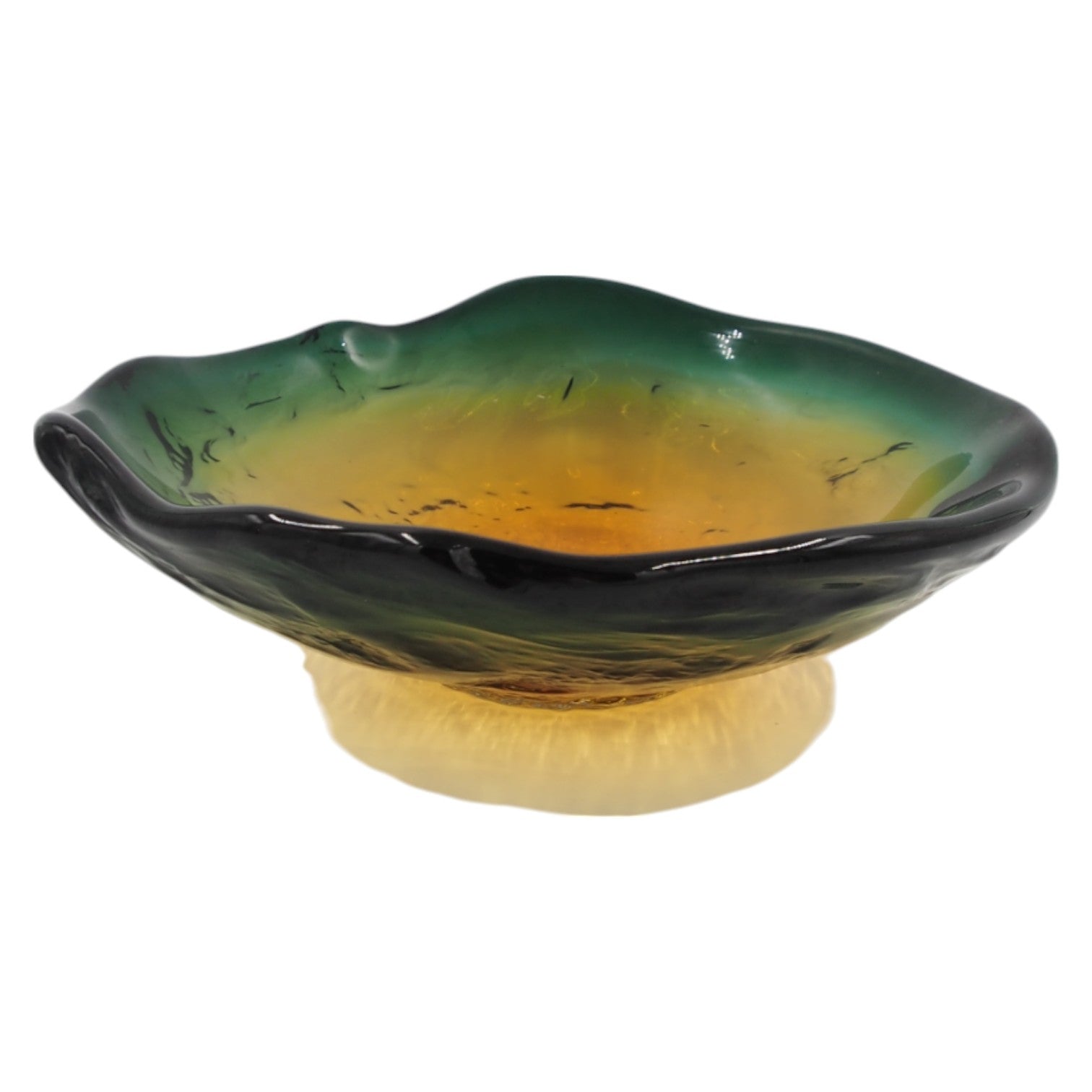Unikalaus dizaino dekoratyvinė stiklo lėkštė, puikiai tinkanti tiek kaip išskirtinis interjero akcentas, tiek kaip stilingas stalo dekoro elementas. Švelnus žalsvai gelsvas tonas pereina į sodresnį atspalvį, primenantį gamtos įkvėptus motyvus. Dėka neįprastos formos ir subtilių spalvinių perėjimų, ši lėkštė traukia akį ir suteikia elegancijos bet kokiai erdvei.