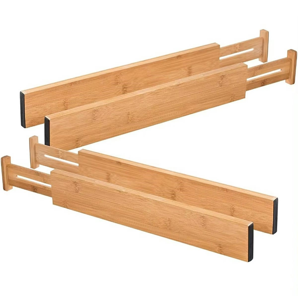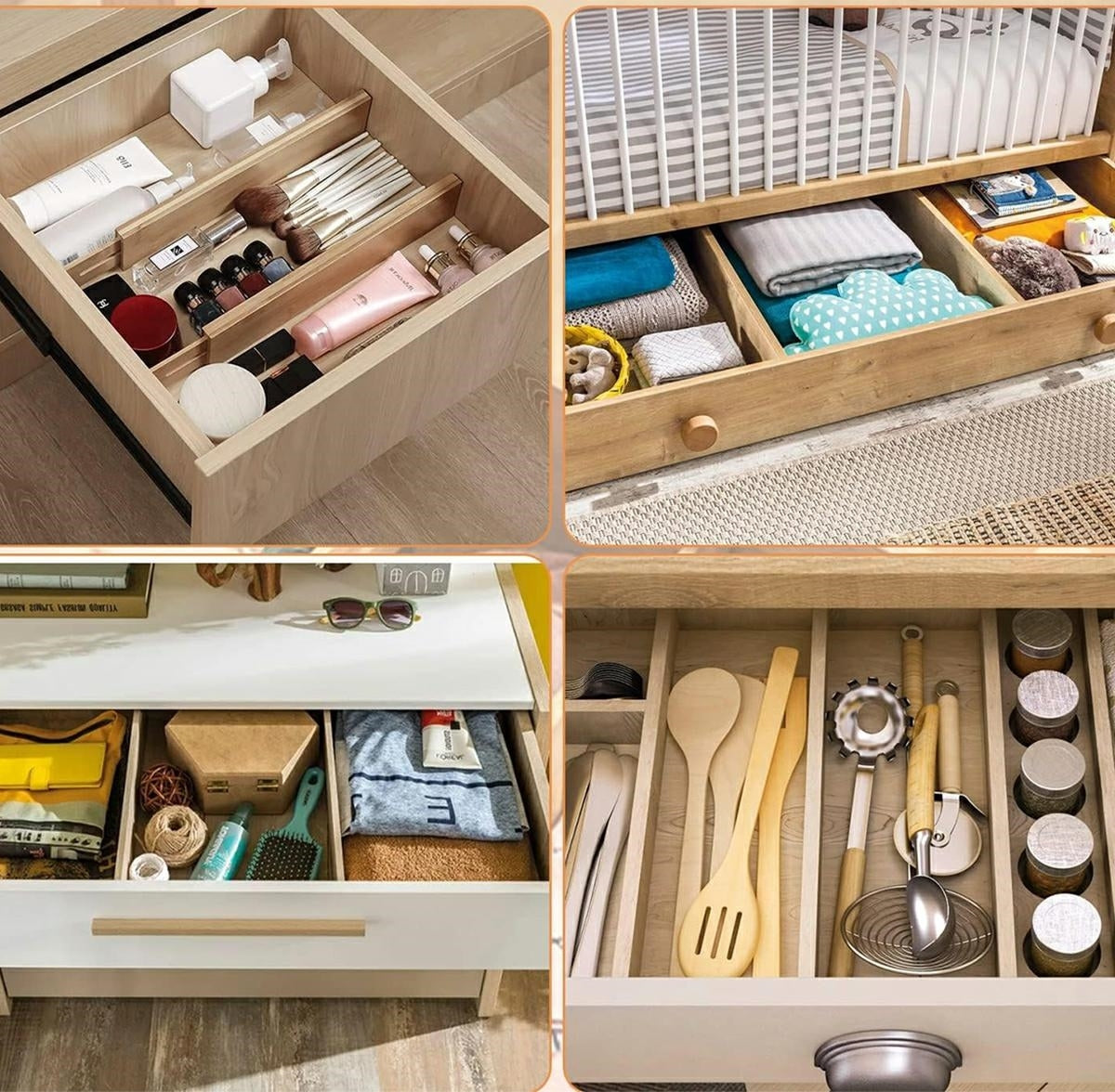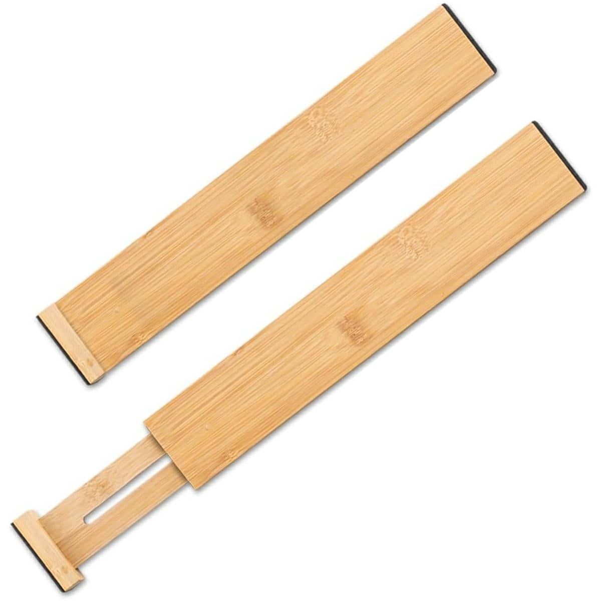 Itin praktiški, išlankstomi stalčių organizatoriai - 4 vnt. Skirstytuvas leidžia paprastai ir pigiai organizuoti kosmetikos ar apatinio trikotažo kolekcijas, padalijant stalčių į dvi bet kokio dydžio dalis. Galimybė sulankstyti ir atsiskleisti iki 43–56 cm pločio leidžia pertvarai puikiai tilpti į stalčių. Pagaminta iš lengvos ir patvarios bambuko medienos.