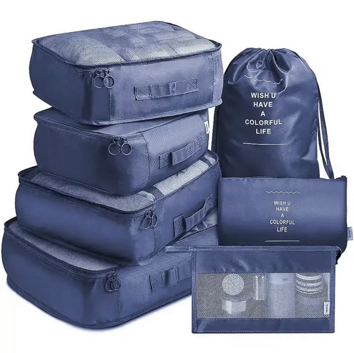 Patogus turistų maišelių rinkinys, susidedantis iš 8 elementų - 3 paketėliai, 3 maišai, kosmetinė ir krepšys. Jie visi yra su įmontuotu užtrauktuku (už maišo) ir turi daug saugyklų ir kišenių! Tai puikus būdas išlaikyti tvarką jūsų kasdienėje kosmetikoje! Jie taip pat yra puikūs aksesuaras keliaujant, lengvai pritaikydami visas svarbiausias kosmetikos ir kitus tokio tipo aksesuarus, tokius kaip lūpų dažai, milteliai ar šepetėliai. Protingos konstrukcijos dėka taip pat galite sėkmingai saugoti apatinius drabužius ir kojines. Rinkinys lengvai telpa į rankinį bagažą ir neužima tiek vertingos vietos. Visi komplekto elementai turi patogią rankeną, dėl kurios jie yra patogiai nešami.