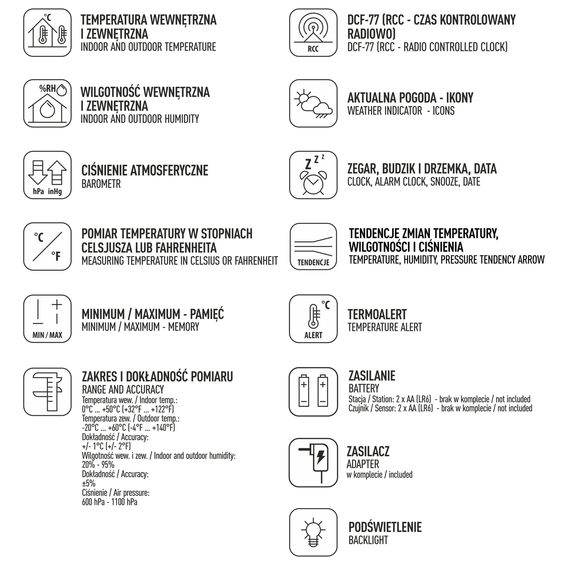 Juoda ir sidabrinė – stilinga, daugiafunkcė ir moderni. Mūsų orų stotelė su duomenų perdavimu iki 90 m ne tik padės stebėti orus, bet ir veiks kaip žadintuvas, slėgio matuoklis, drėgmės kontrolės prietaisas ir dar daugiau!