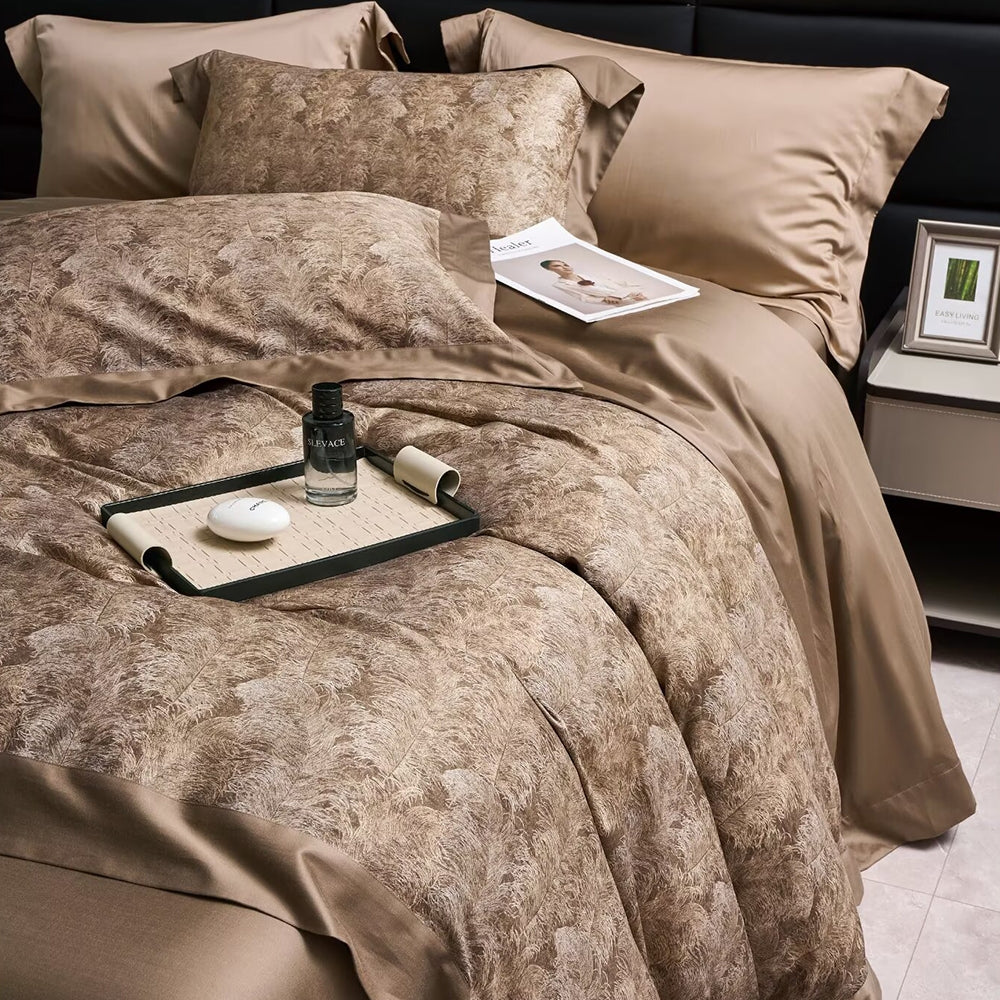 Prabangus patalynės komplektas su natūraliu raštu – šilko švelnumas ir žemės tonų elegancija
