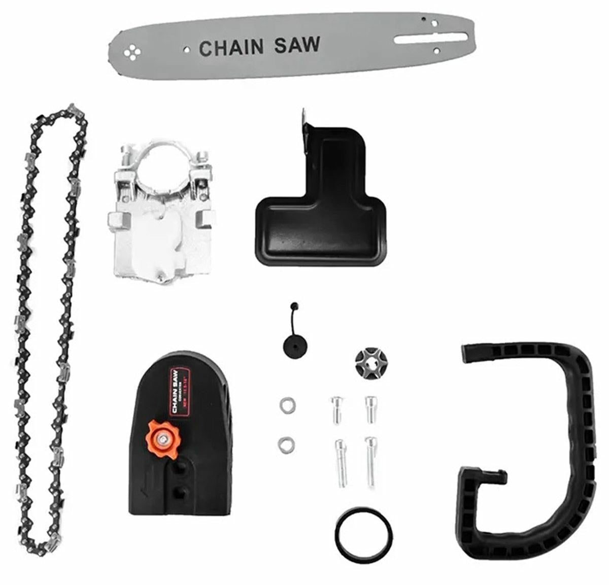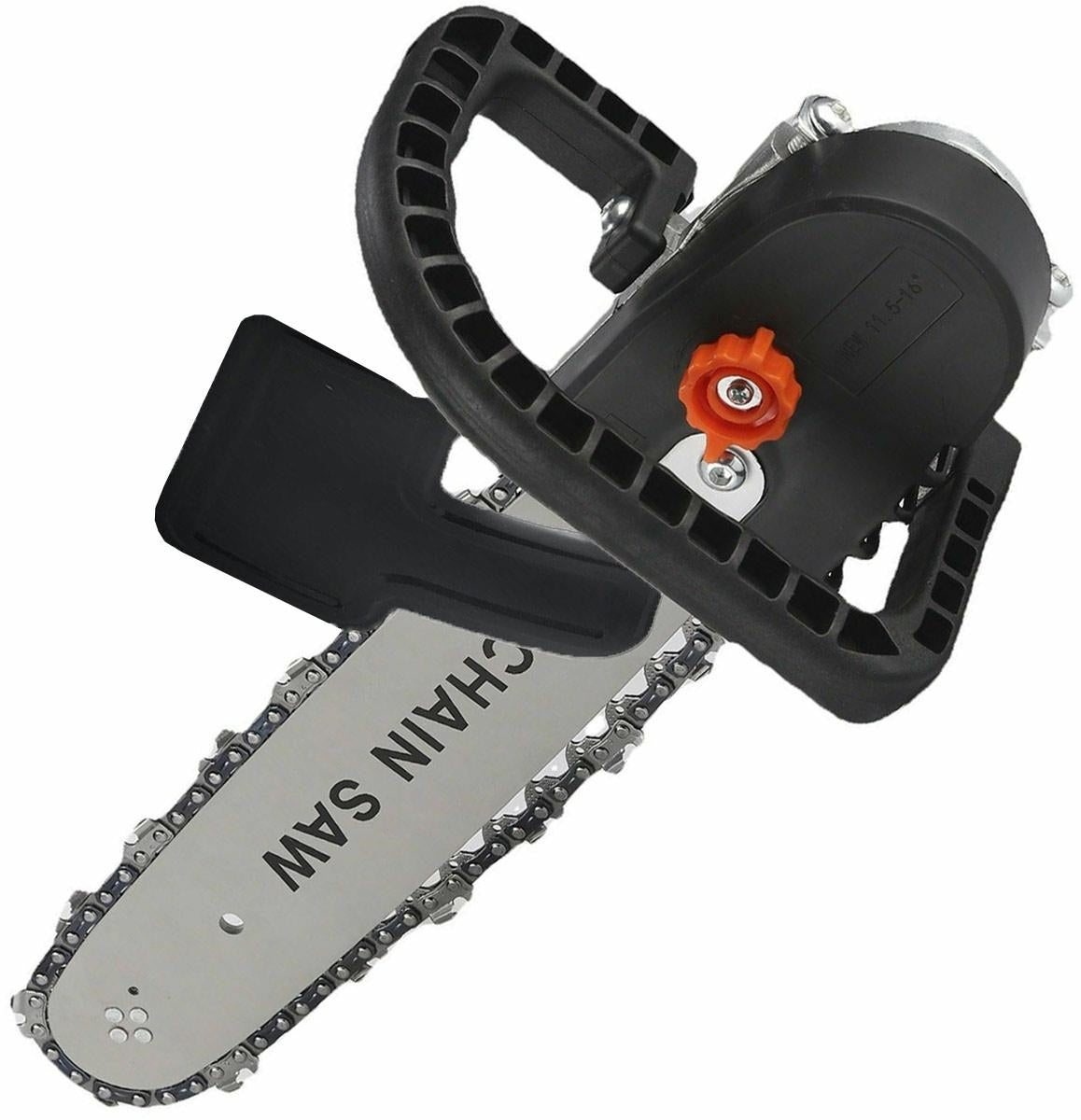 Priedas kampiniam šlifuokliui - grandininis pjūklas. Itin praktiškas įtaisas, kuris jūsų šlifuoklį pavers patogiu grandininiu pjūklu. Konverteris montuojamas į "bulgarkės" lizdą kaip klasikinis diskas. Patogi, užapvalinta rankena užtikrina didelį darbo komfortą. Specialus dangtelis už grandinės padidina saugumą naudojimo metu.