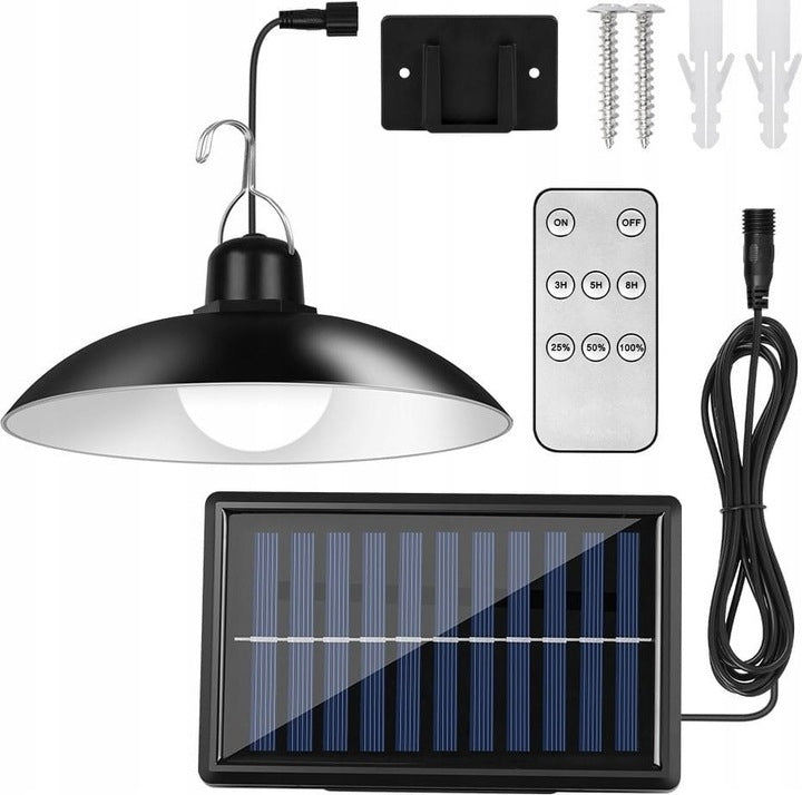 Komplekte: lemputė, saulės panelė, tvirtinimo elementai (varžtai, kaiščiai), pakabinimo kabliukas, nuotolinio valdymo pultelis