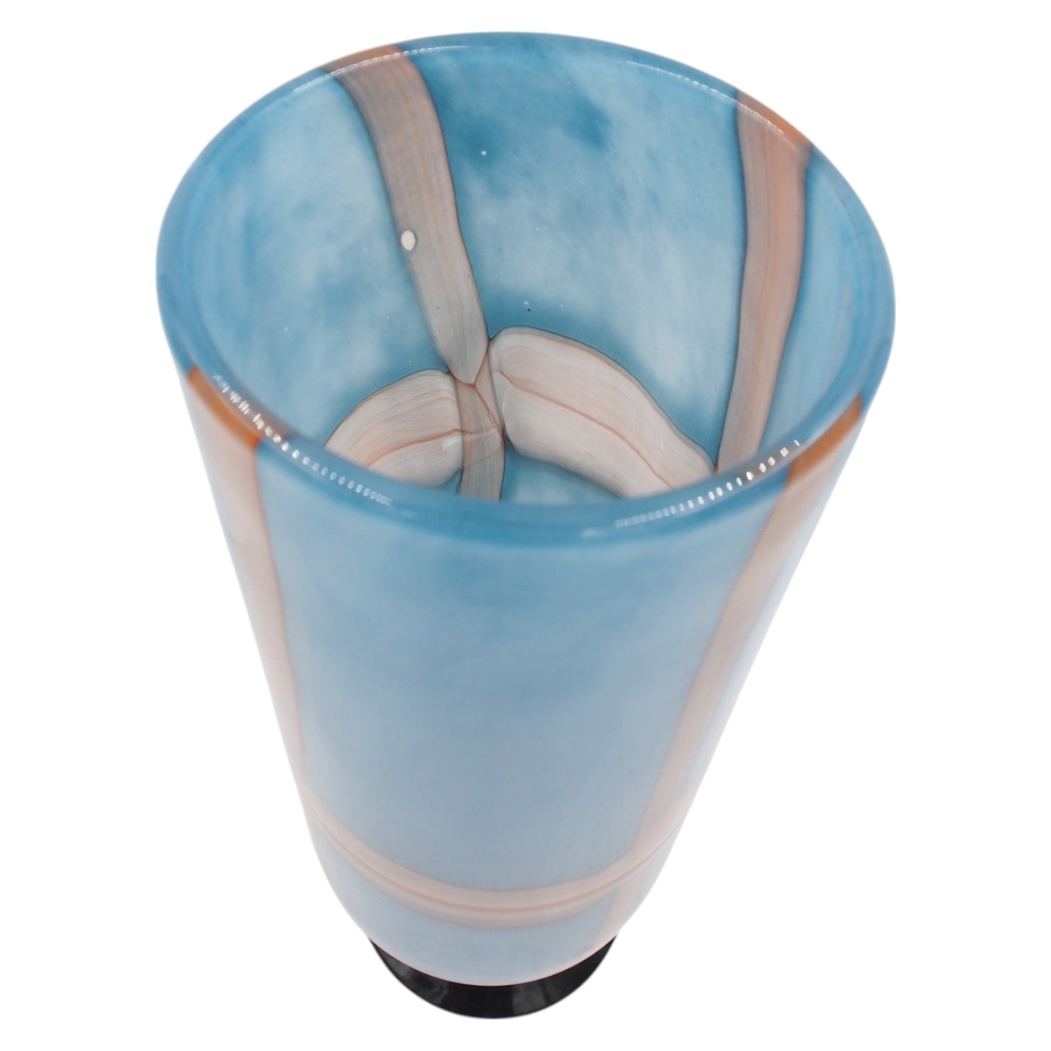 Išskirtinio dizaino stiklinė vaza su elegantišku pagrindu – puikus akcentas jūsų interjerui. Modernios violetinės spalvos su tamsiomis linijomis dekoras suteikia išraiškingumo, o tvirta konstrukcija leidžia naudoti tiek su gyvomis, tiek dirbtinėmis gėlėmis.