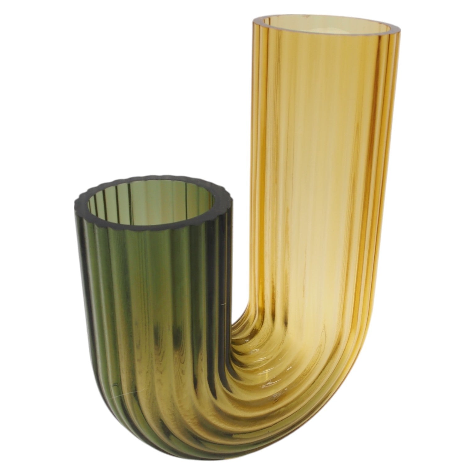 Išskirtinio dizaino vaza iš briaunuoto stiklo su moderniu išlinkimu – tikras interjero akcentas. Unikali U formos konstrukcija suteikia dinamiškumo, o šilta gelsvai žalsva spalva praturtins bet kokį interjerą. Puikiai tinka tiek šviežioms gėlėms, tiek kaip dekoratyvinis objektas.