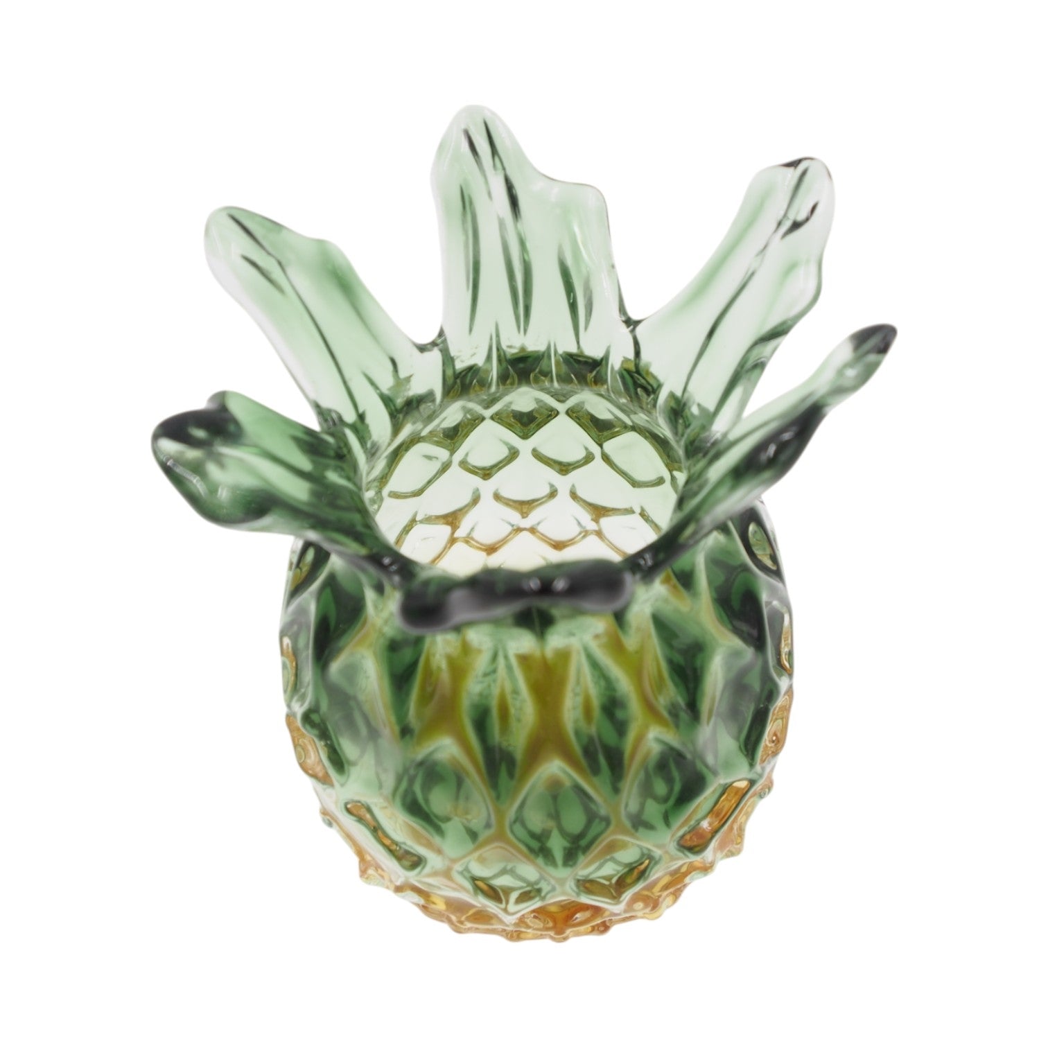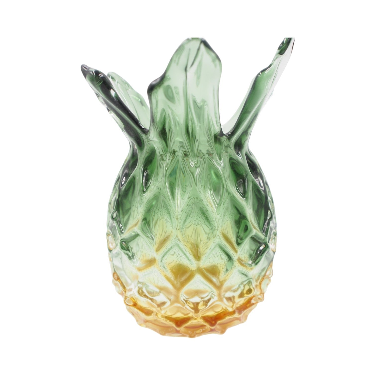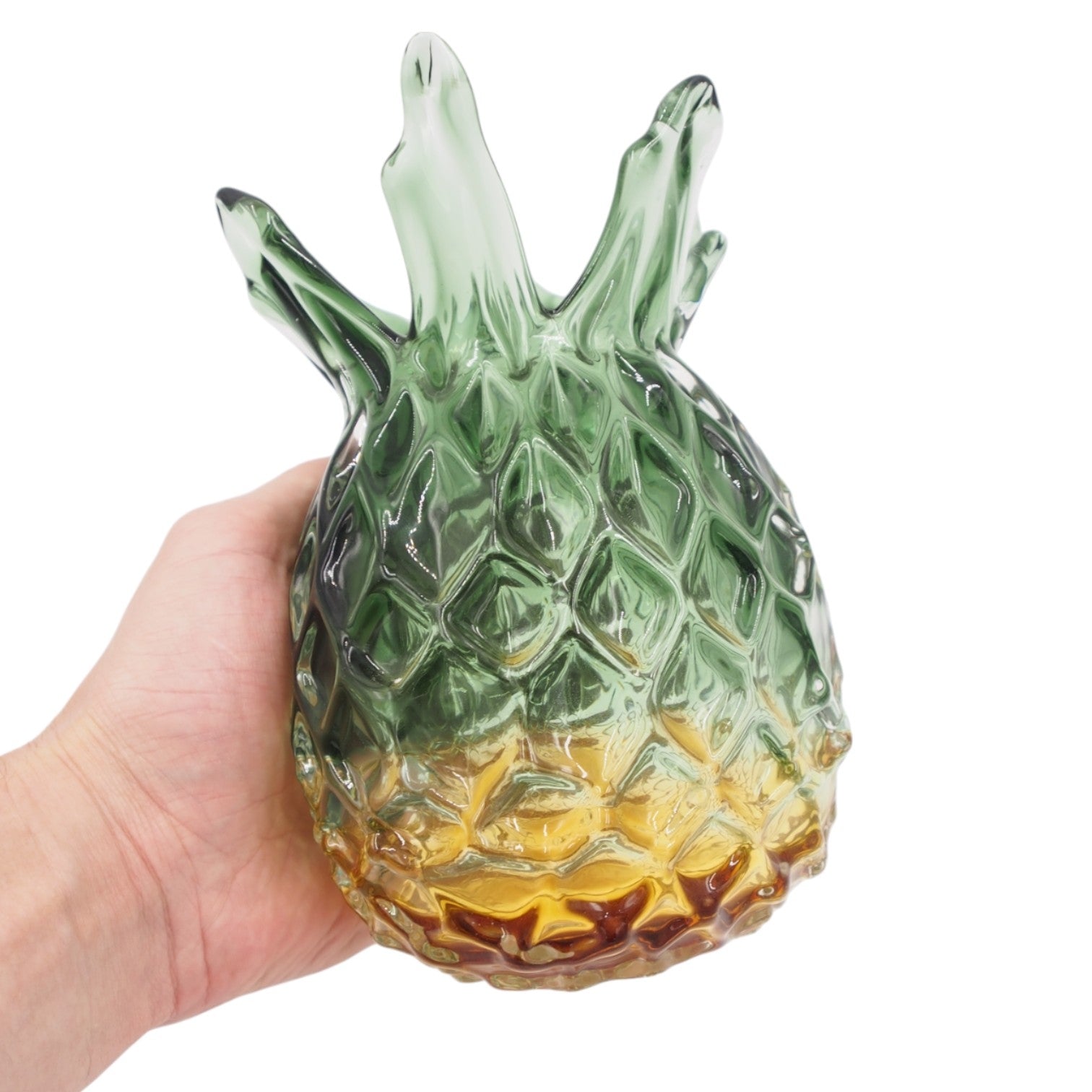 Ši išskirtinė stiklinė vaza, atkurianti prinokusio ananaso formą, neabejotinai taps pagrindiniu akcentu jūsų interjere. Tamsiai žalias viršus ir pereinanti geltona spalva sukuria natūralią, vasarišką estetiką, o kruopščiai išformuotas paviršius žaismingai atspindi šviesą.