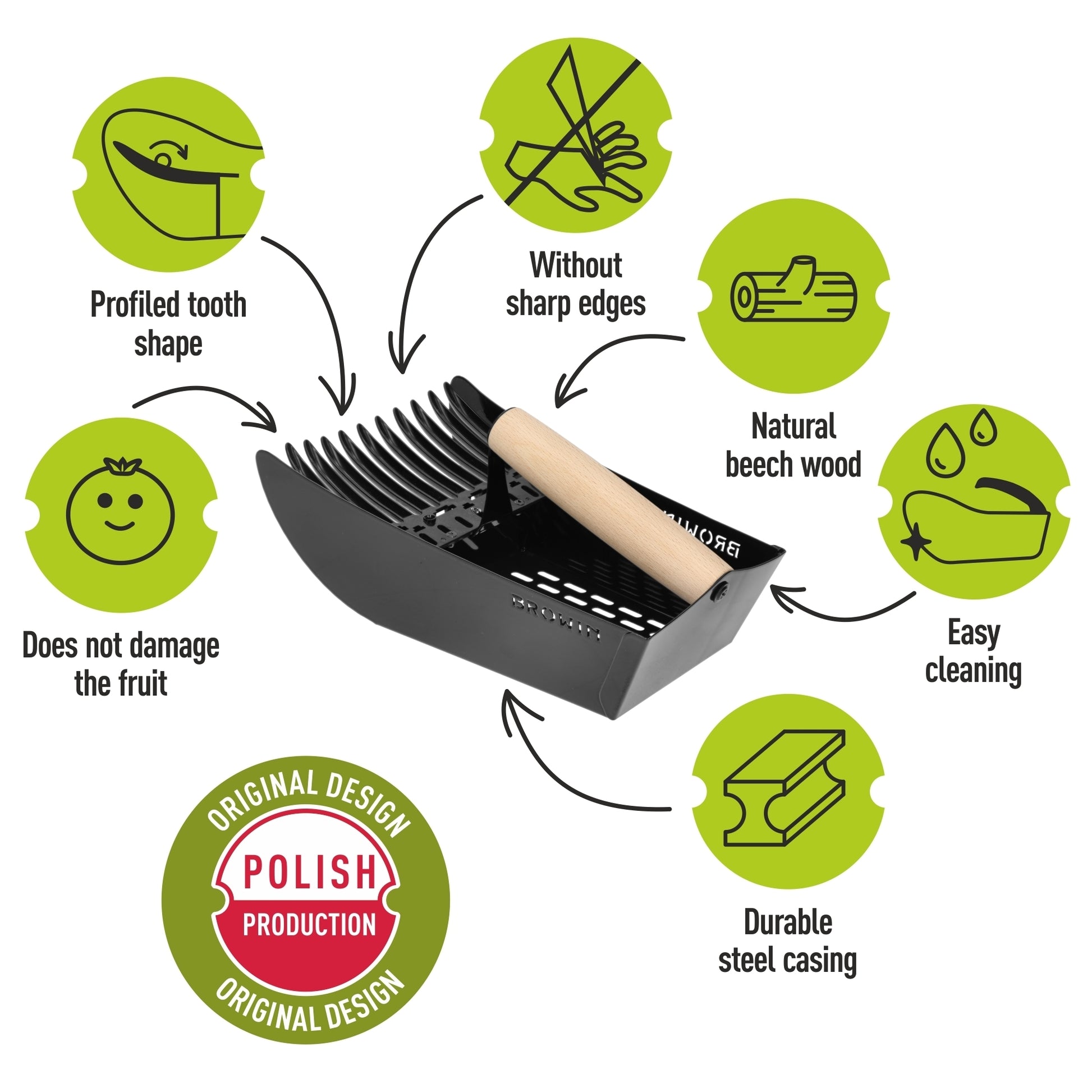 Tinkamai naudojamas šis skintuvas tarnaus jums daugelį metų. Juo galėsite surinkti daugiau vaisių vienu kartu. Naudojimo patogumas, patvarumas, atsparumas rūdims, išskirtinė ir kompaktiška forma – tai tik dalis šio profesionalaus įrankio privalumų, kuriuos įvertinsite praktiškai.