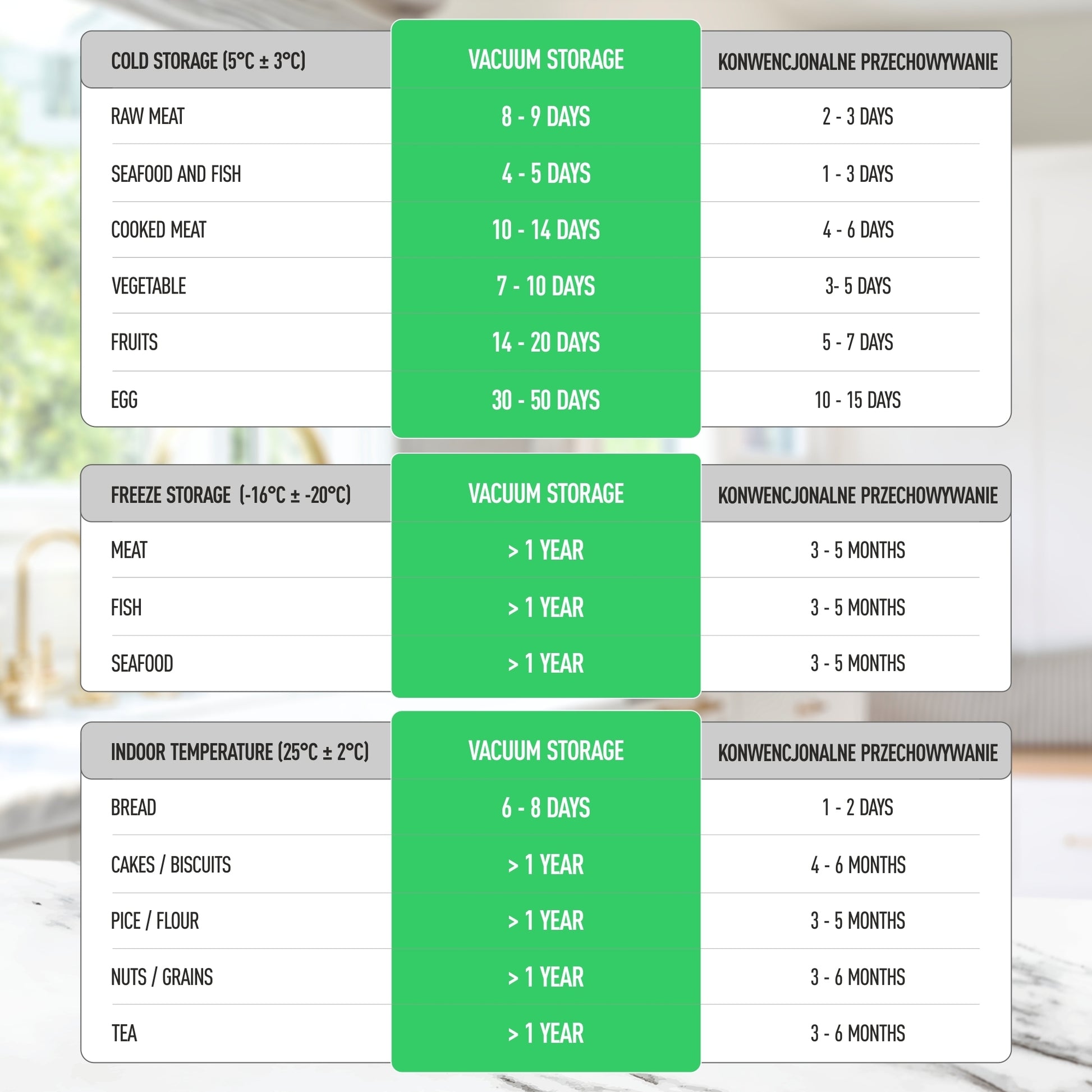 Naudojant vakuuminį pakavimo aparatą, maisto šviežumas gali būti išlaikytas iki 8 kartų ilgiau – visiškai natūraliai, be konservantų.