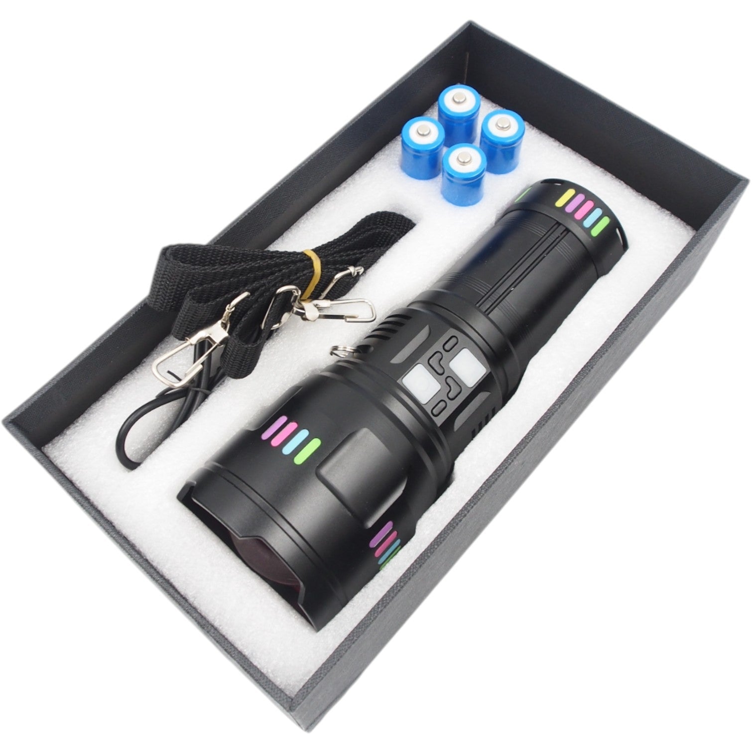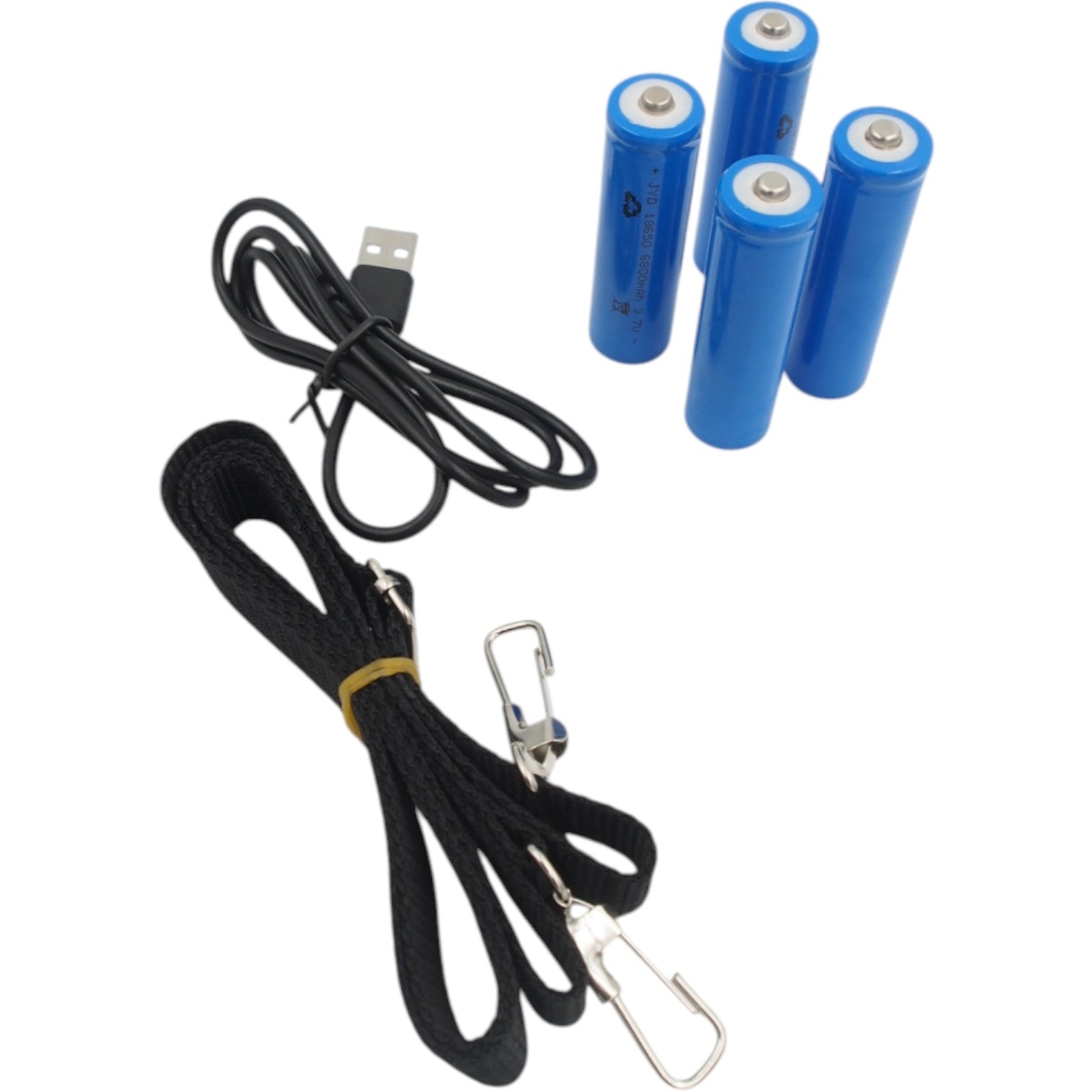 Komplekte: prožektorius, 4 akumuliatoriai, įkrovimo laidas USB, tvirtas dirželis patogiam nešiojimui.